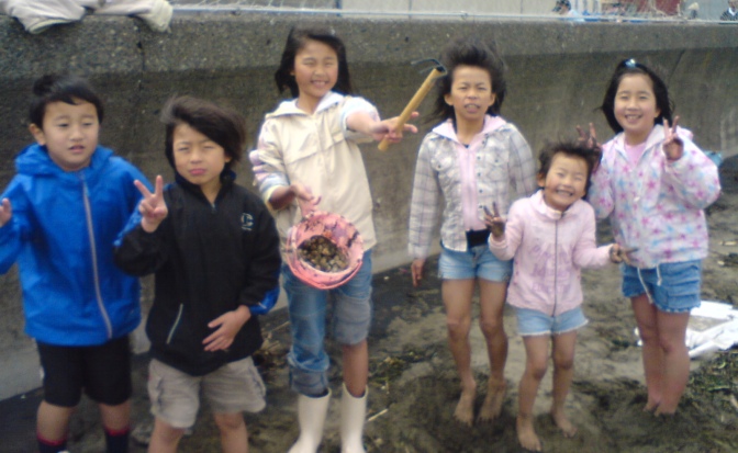 でもポイントを見つけると、一掻きでハマグリがザクザク獲れます。
