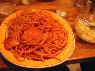 スパゲッティ、太いパスタに、真っ赤なケチャップのナポリタンを